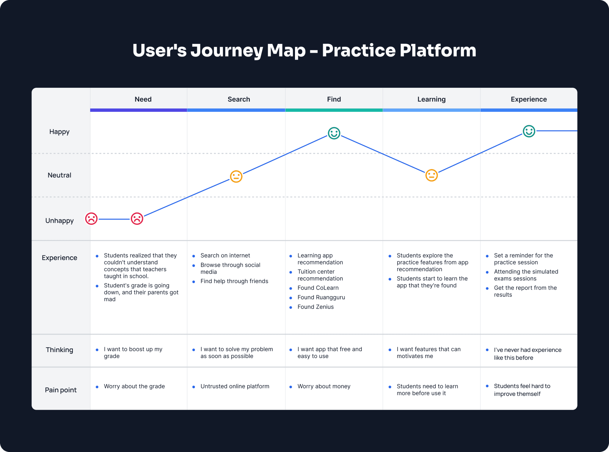 We try to explore the problem by creating a customer journey. We defined how the student will interact with the Colearn.